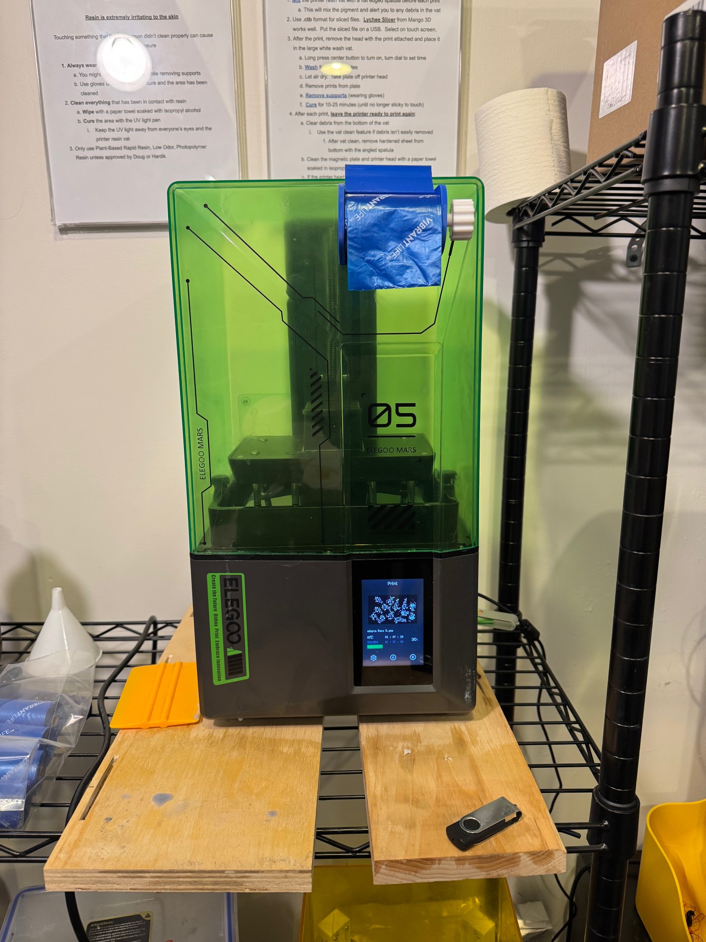 ⚠ Always check the resin bottle's SDS (Safety Data Sheet) before using a new resin. SDS sheets for all space-approved resins are kept [TODO: location]. Do not use resins not approved by Logan.